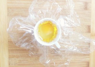 Mettete in una tazzina della pellicola, rompere l’uovo dentro con delicatezza, fare un fagottino abbastanza alto con dentro l’uovo ed immergerlo in acqua calda (non deve bollire, ma sobbollire) per 5 minuti.